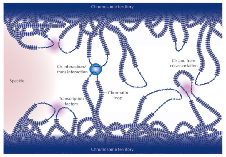 Figure adapted from: Fraser and Bickmore, 2007. This figure shows some of the potential chromatin configurations that a gene might be part of, and why this could lead to coordinated expression of multiple genes.