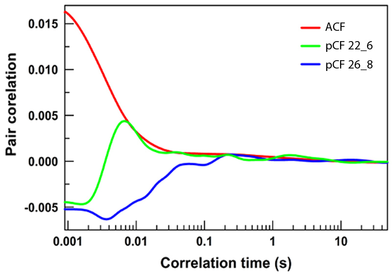 Shown are examples of three different forms of analysis for a given pixel. In red is a single pixel correlated to itself over time. It starts off highly correlation, but over time those molecules move, and the correlation decreases. Slow moving molecules will stay correlated longer. In blue is now comparing two pixels – they never become correlated and so no molecules move between these during the experiment. Finally, in green is an analysis between two pixels which did experience molecular movement.
