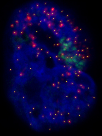 This is a projection of a Z-stack of images. Blue is DAPI (a DNA stain), green marks the location of the Lac array, red is the single molecule RNA FISH that allows us to detect and count individual transcripts, and the yellow dots are from our spot-picking algorithm.