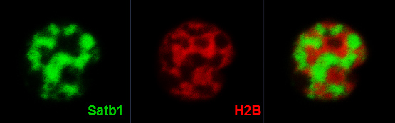 The distribution of Satb1 (in green) inside a developing thymocyte resembles a “cage-like” architecture: it fills the gaps between regions of tightly compacted chromatin (in red).